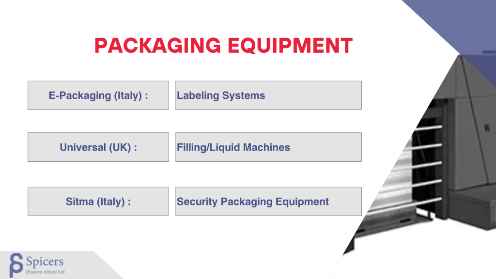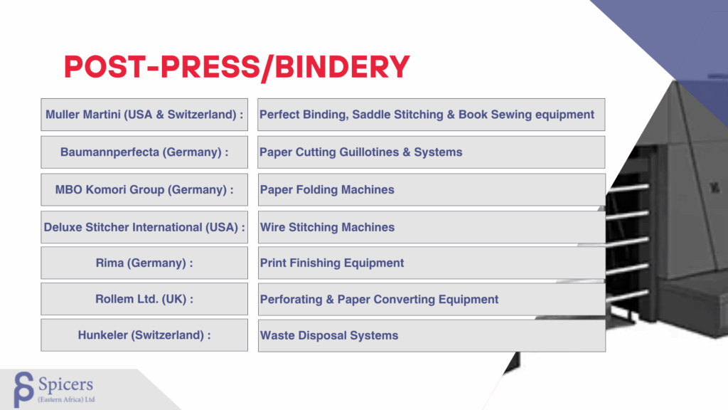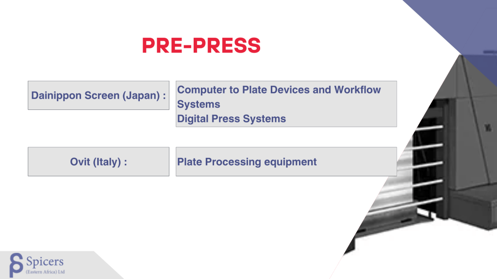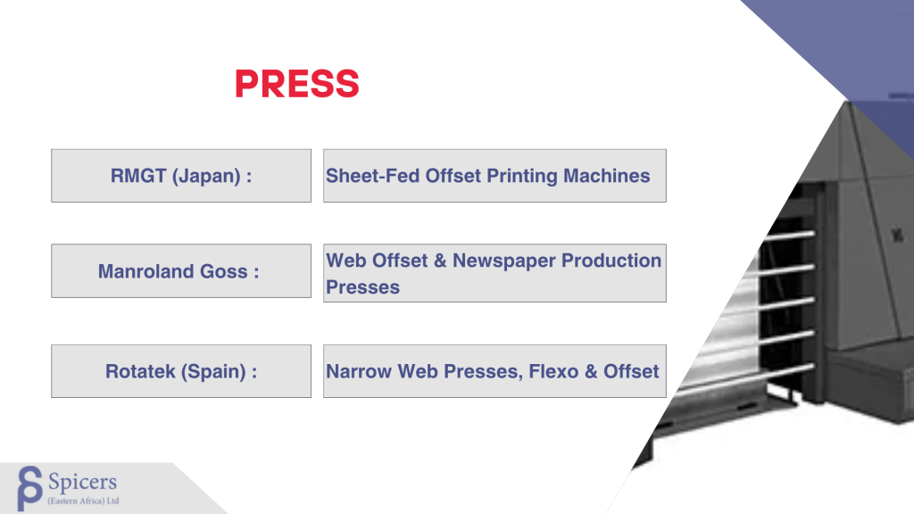 We are the sole East African Agents / Distributors for the world's leading printing and packaging equipment manufacturers. SPICERS (EASTERN AFRICA) LIMITED has been established in Kenya since 1953 during which time we have supplied Printing and Packaging Equipment to virtually all of the established Printers and Packaging companies throughout the East Africa Region.